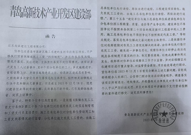 但建设部出具的答复意见书称管委会做了很多工作:为解决问题,高新区建设部采取了一系列措施,多次对总包单位及劳务单位进行信用考核处罚、全区通报,并向其公司总部发送警示函,管委主要领导还亲赴南京调度案件化解。此外,高新区建设部还联合党群工作部、高新公安、城阳劳动监察大队等部门多次约谈相关单位,城阳劳动监察大队也已介入调查,下达责令改正决定书并作出行政处罚,但问题依然未能得到解决。