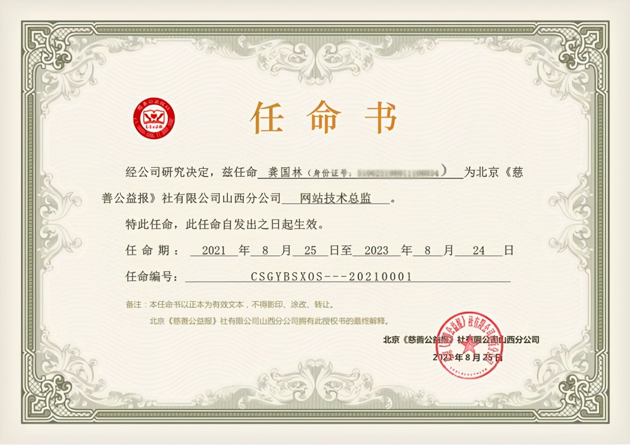 经公司研究决定,兹任命龚国林为北京《慈善公益报》社有限公司山西分公司 网站技术总监 。